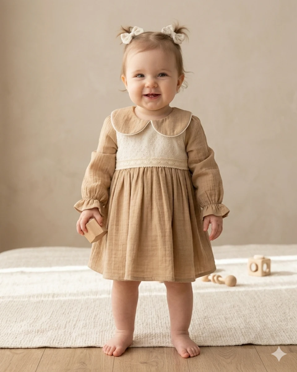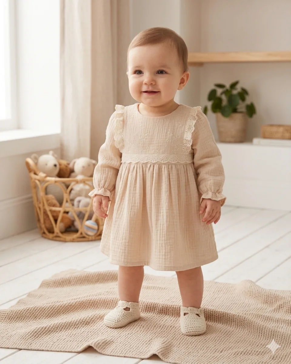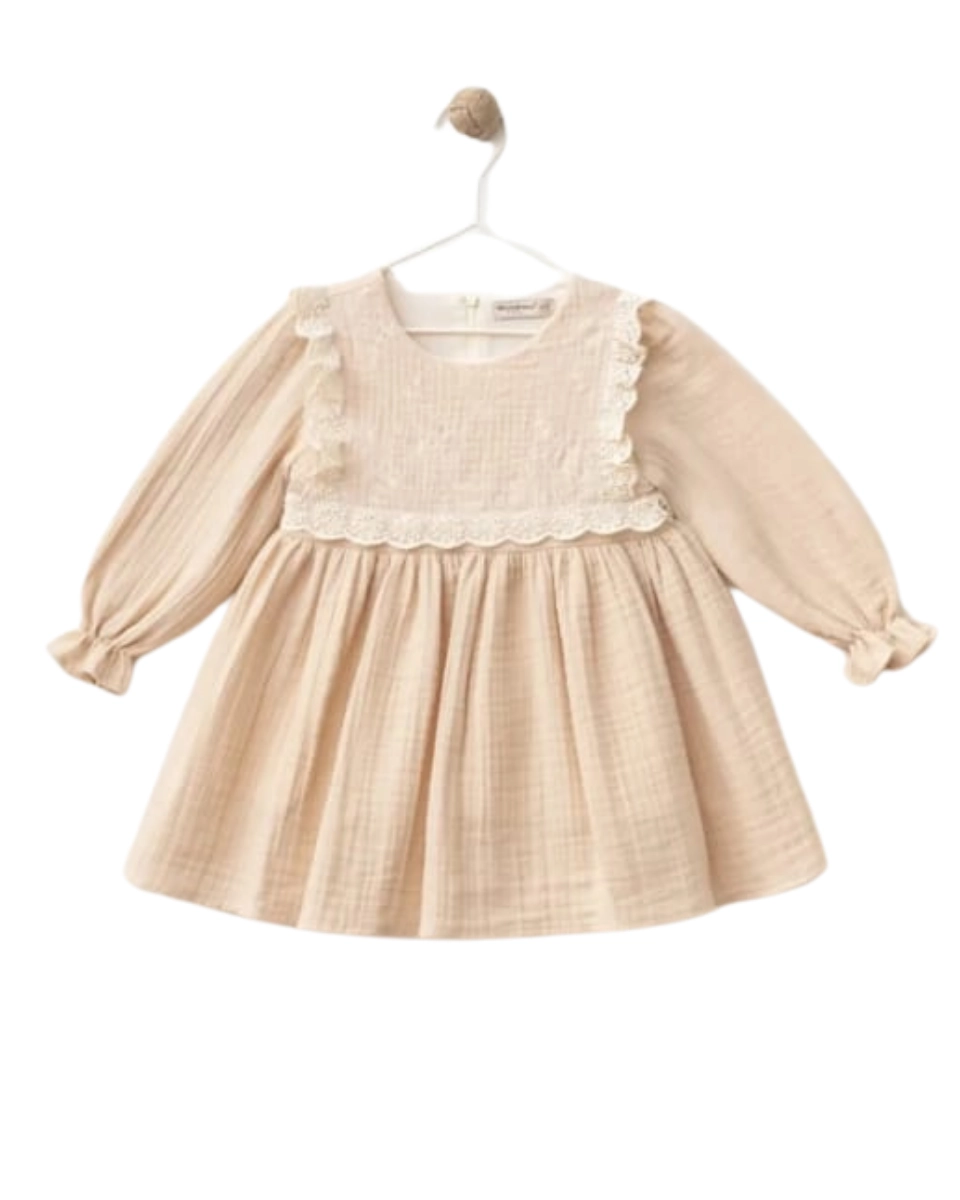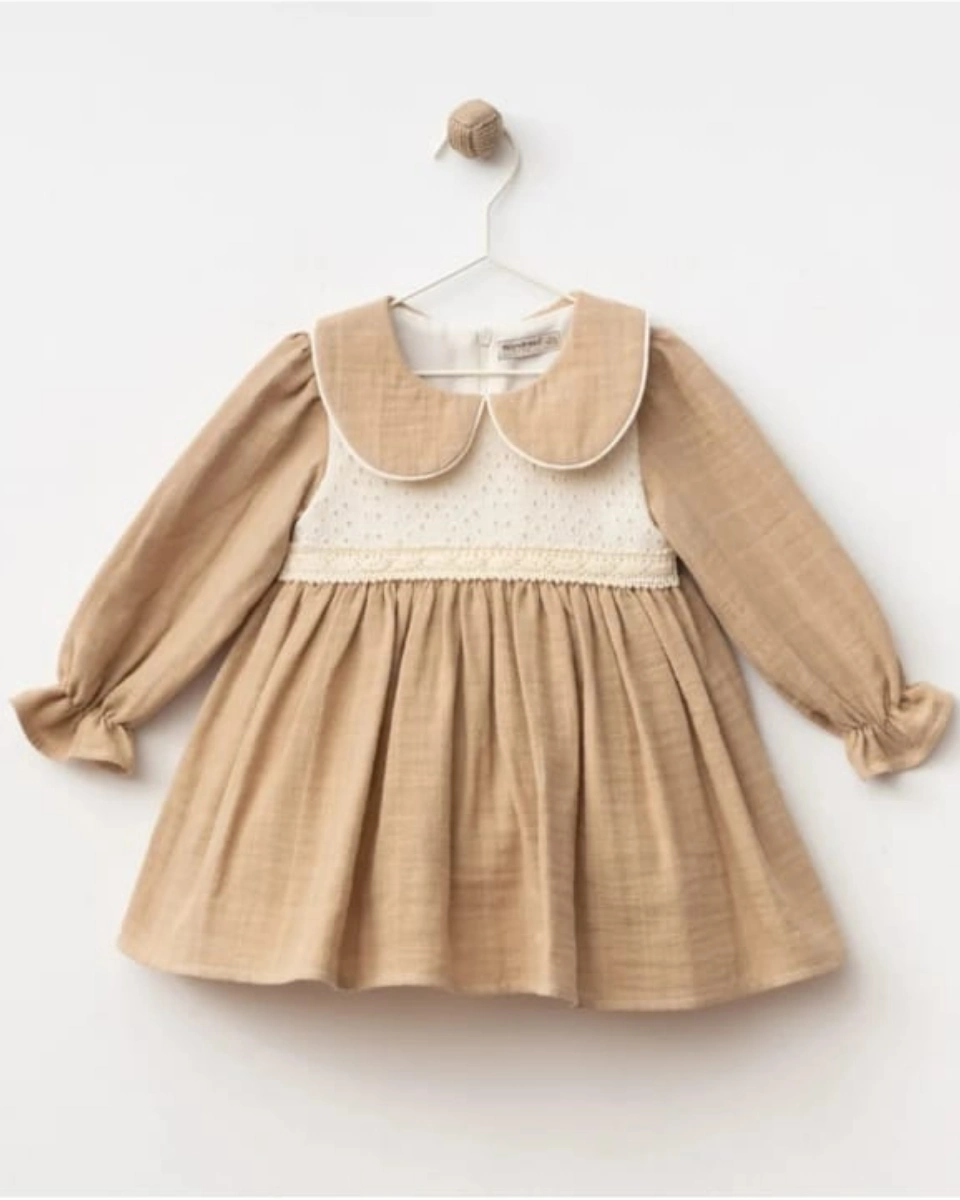 Küçük hanımların gardırobuna hem nostaljik bir dokunuş hem de modern bir konfor katmaya ne dersiniz? %100 pamuklu müslin kumaştan üretilen bu elbisemiz, bebek ve çocuk cildinin hassasiyeti göz önünde bulundurularak tasarlandı. Göz alıcı dantel detayları ve doğal dokusuyla, hem özel günlerde hem de günlük şıklıkta en favori tercihiniz olacak.