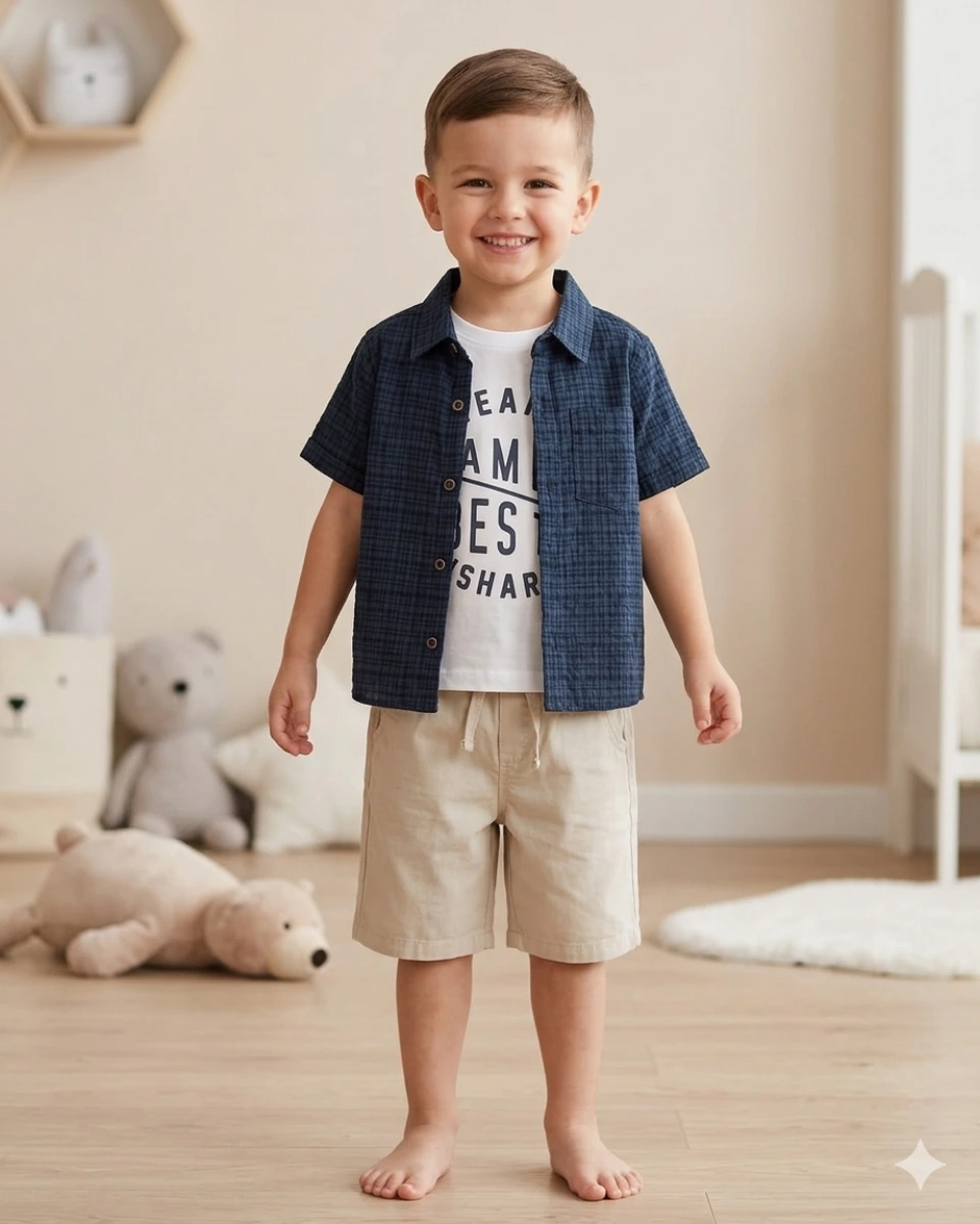 Keten Gömlekli Üçlü Kaprili Erkek Çocuk Takım, minik beylerin stiline zarif bir dokunuş! Yaz aylarının nefes alan dokusu keten, şimdi en şık haliyle çocuklarınızın gardırobunda. Özel günlerden hafta sonu gezmelerine kadar her an her yerde konforlu bir kullanım sunan bu üçlü takım, hem ebeveynlerin hem de çocukların favorisi olacak.